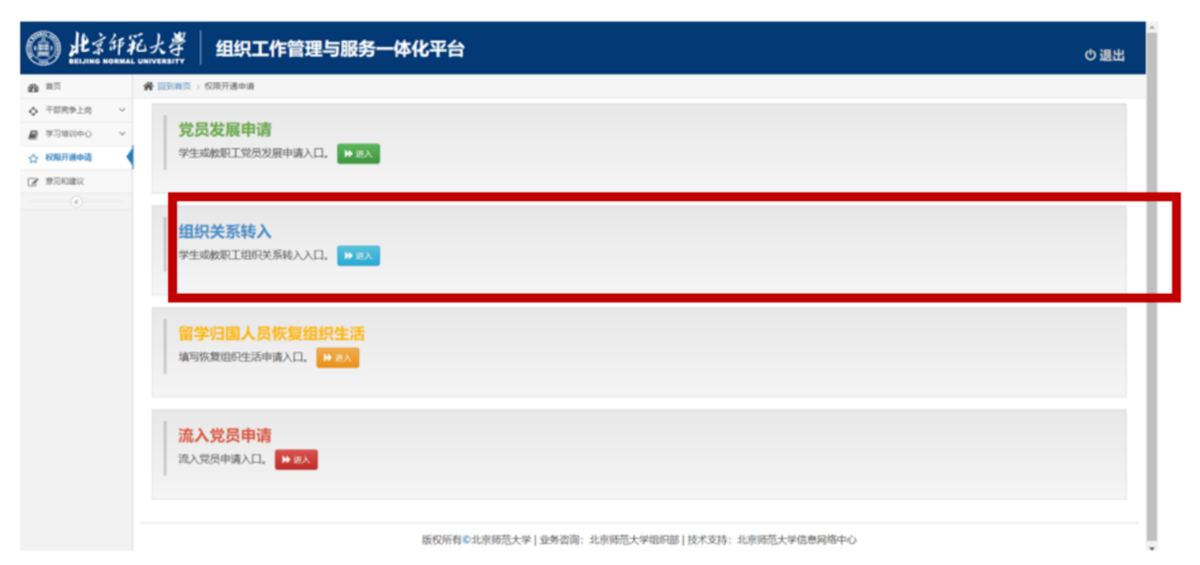 在学校组织工作管理一体化平台(zzbgz.xingba88.com)中填写转入信息。用户名和密码与本人信息门户登录信息一致,也可以从学校官网-信息门户-左侧“常用应用”的“组织工作管理系统”中登录。登陆系统后,选择“权限开通申请”——“组织关系转入”,按照介绍信内容,填写本人基本信息及组织关系转入信息。学部党委和校党委组织部逐级审核后,即可完成转入。