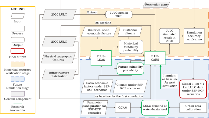 论文基于斑块级土地利用变化模拟模型(PLUS)和全球变化评估模型(GCAM),制备了SSP-RCP情景下全球2020~2100年1km土地利用数据集。研究首先使用GCAM模型模拟全球235个流域的土地利用需求,并通过多元回归模型校准GCAM模型产生的城市LULC需求,然后使用PLUS模型迭代模拟了由未来适宜性概率驱动的LULC斑块水平的变化。