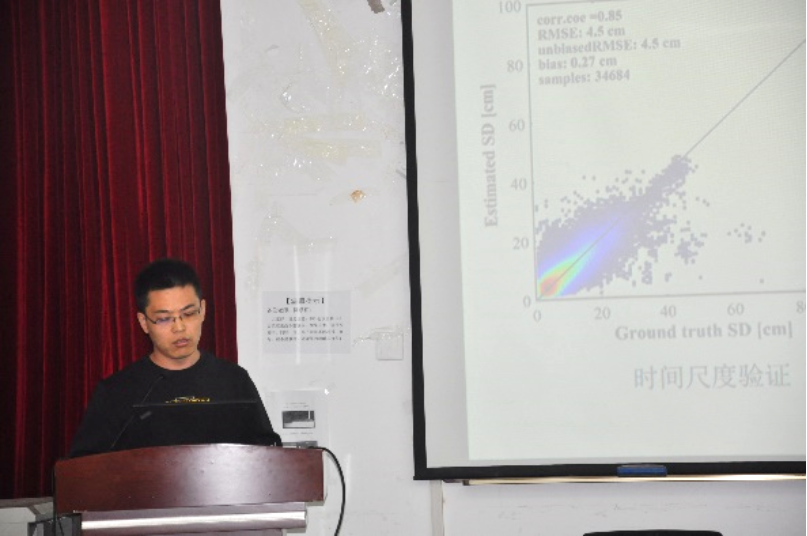 杨建卫同学对利用微波物理模型和机器学习方法反演雪水当量的研究进行了介绍。利用微波前向模型加入获取有效雪粒径,以及从理论上验证雪粒径加入机器学习方法中能够提高雪深反演精度。