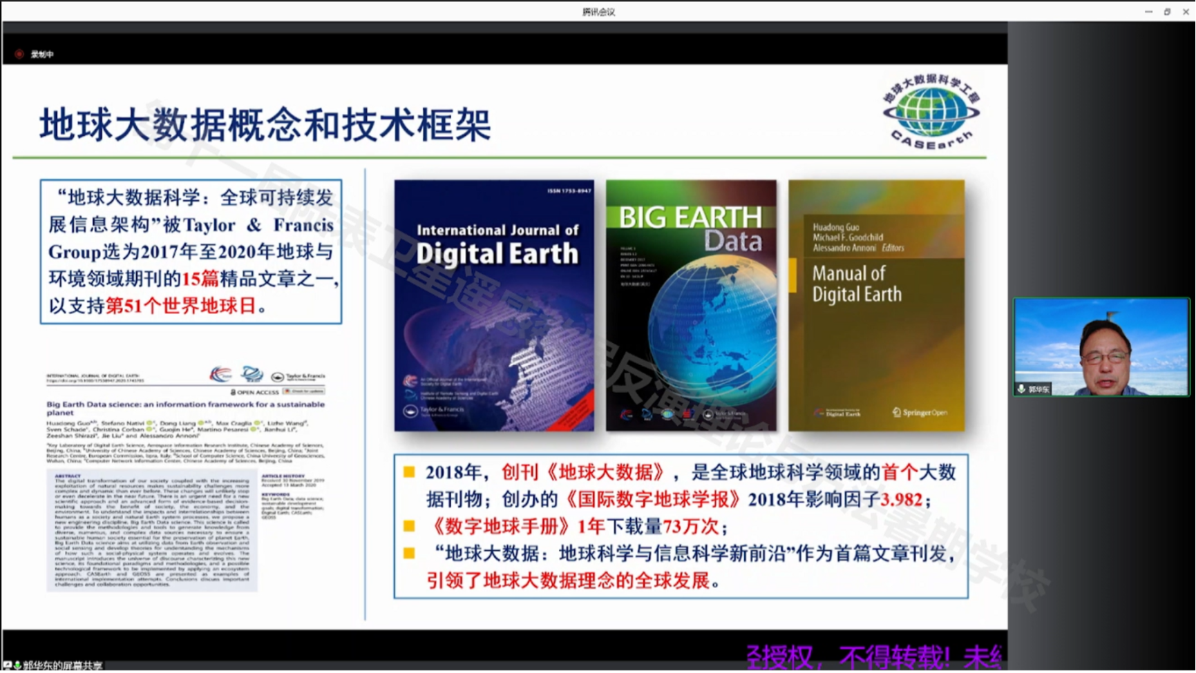 特邀报告环节,地球科学学家,中国科学院院士、发展中国家科学院(TWAS)院士、国际欧亚科学院院士、中国科学院A类战略性先导科技专项“地球大数据科学工程”首席科学家郭华东研究员为学员们作了“CBAS-可持续发展研究新平台”的报告。报告从科学大数据和地球大数据讲起,阐述了地球大数据的特点和作用、概念和技术框架,并对中国科学院A类战略性先导科技专项“地球大数据科学工程专项” 项目做了详细介绍,包括总体目标、云服务基础设施、智能服务型CASEarth DataBank系统、地球大数据共享服务平台等。随后,郭院士从地球大数据促进可持续发展的角度,解读了我国在联合国《2030年可持续发展议程》的可持续发展目标(SDGs)实现中起到的积极支撑作用。最后,介绍了可持续发展大数据国际研究中心的成立和开展的研究。精彩的报告拓宽了学员的学术思路,受到了学员的热烈欢迎和好评。