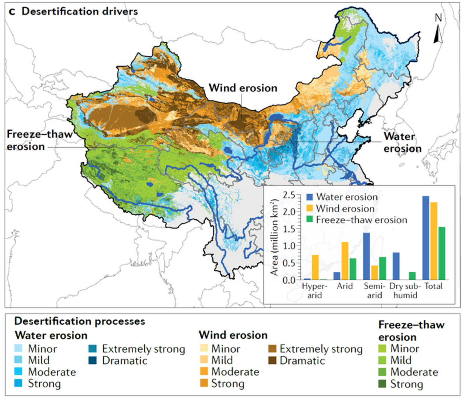 气候变化和人类活动共同作用导致我国旱区荒漠化问题严重,研究表明,导致旱区荒漠化的关键过程为风蚀、水蚀、冻融侵蚀,水蚀影响的面积最大(37.4%),主要影响区域分布在半干旱和干旱半湿润区,但强度多为微度、轻度和中度;风蚀主要影响极端干旱区和干旱区,强度多为强、极强和剧烈;冻融侵蚀主要影响青藏高原地区,强度多为微度、轻度和中度(图2)。