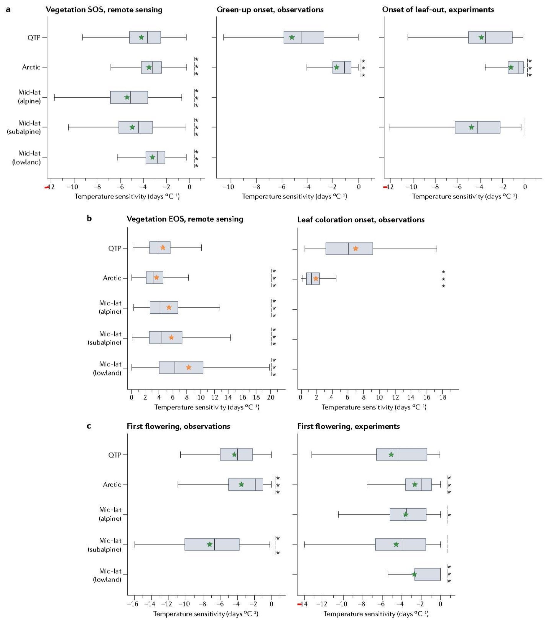 图5. 青藏高原与北极地区和中纬度地区草地物候的温度敏感性比较。QTP:青藏高原;Arctic:北极地区(>60 °N);Mid-lat (alpine):中纬度高山地区(30–60°N,海拔> 3000米);Mid-lat (subalpine):中纬度亚高山地区(30–60°N,海拔在1000到3000米之间);Mid-lat (lowland):中纬度低地地区(30–60°N,海拔< 1000米)。(a)春季叶物候的温度敏感性,从左到右依次为基于遥感植被指数计算的植被生长季开始期,基于观测的返青始期和基于控制实验的展叶始期。(b)秋季叶物候的温度敏感性,左边是基于遥感植被指数计算的植被生长季结束期,右边是基于观测的叶变色始期。(c)基于观测数据(左)和基于控制实验(右)的初花期的温度敏感性。每个箱中的直线和星号分别代表了中值和均值。*** P < 0.05,** P < 0.05和* P < 0.10表示该地区的物候温度敏感性与青藏高原有显著差异。