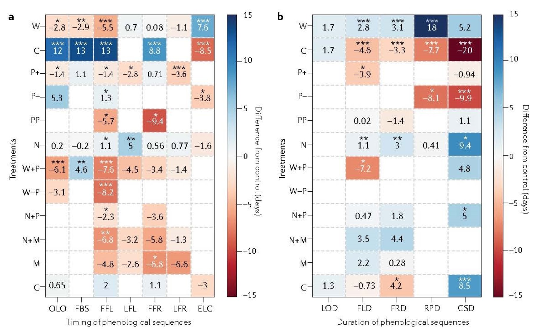 图3. 控制实验中不同处理方式对植物物候的影响。(a)各物候期对不同处理方式的响应,包括展叶始期(OLO)、初蕾期(FBS)、初花期(FFL)、终花期(LFL)、初果期(FFR)、终果期(LFR)和叶变色末期(ELC),负值表示物候期提前,正值表示物候期推迟;(b)各物候(发育)阶段持续时间对不同处理方式的响应,包括展叶持续时间(LOD)、花期持续时间(FLD)、结实期持续时间(FRD)、繁殖期持续时间(RPD)和生长季长度(GSD),负值表示持续时间缩短,正值表示持续时间延长。控制实验中的处理方式包括:增温(W)、降温(C)、模拟降水变化(P+,增加降水;P−,减少降水;PP,降水季节性分布变化,详见原文)、氮添加(N)、刈割(M)、放牧(G)、增温增水(W+P)、增温降水(W−P)、加氮增水(N+P)和加氮且刈割(N+M)。