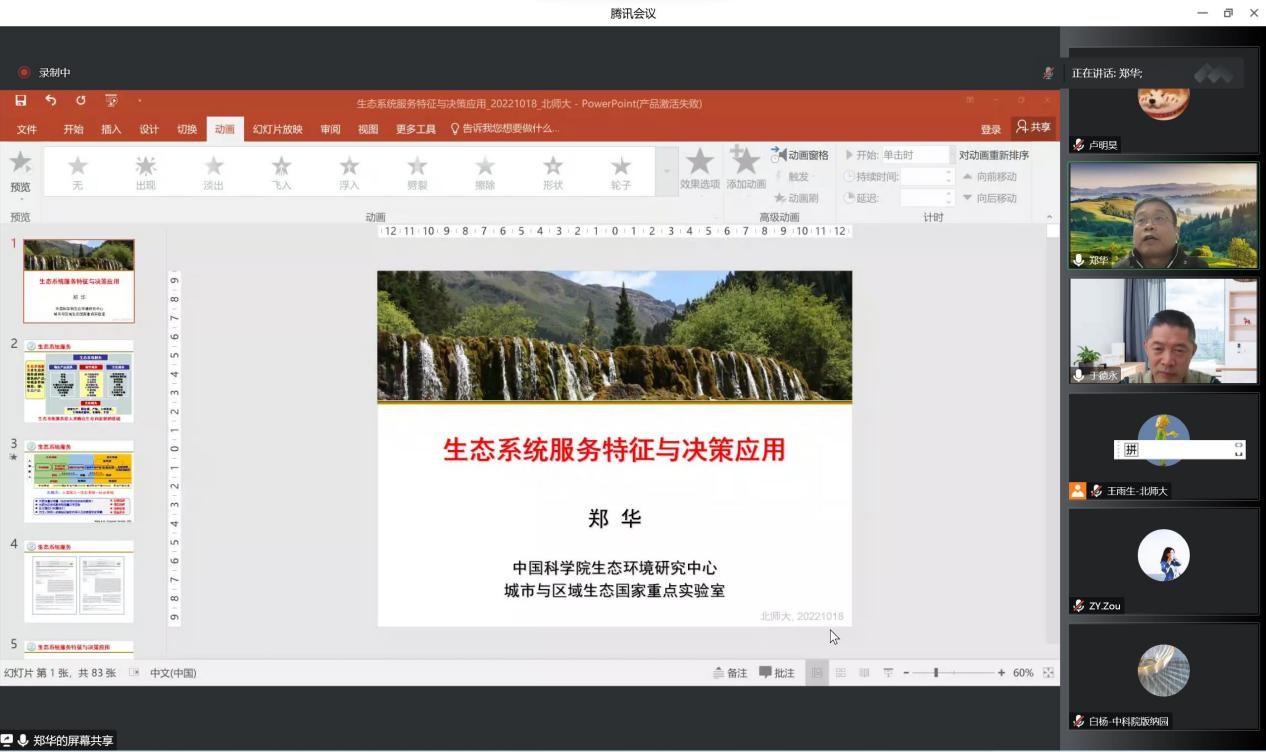 2022年10月18日上午,杏吧视频 自然资源学院资源科学前沿系列讲座第八期——“生态系统服务特征与决策应用”成功举办。本次讲座由于德永教授主持,邀请了中国科学院生态环境研究中心城市与区域生态国家重点实验室副主任、国家杰出青年科学基金项目获得者郑华研究员为主讲嘉宾,讲座以线上会议的形式进行,吸引了校内外三百余名业内专家及学生参加。