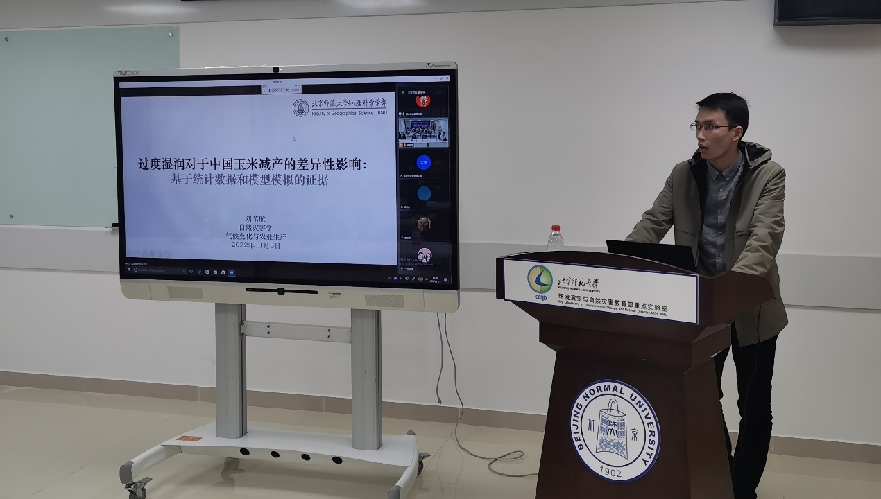 随后,2021级博士生刘苇航进行了“过度湿润对于中国玉米减产的差异性影响”的主题报告。他的研究通过建立过度湿润和作物减产间的关系,发现过度湿润对于中国玉米单产影响总体是负面的,在生育期末期负面影响最显著,且减产程度存在空间差异,最后从自然、人为因素解释空间分异的原因。2020级博士生马恒的报告题目为“青藏高原畜牧业雪灾致灾因子和暴露研究”。他从畜牧业雪灾研究进展综述、积雪深度和牧草高度的致灾因子危险性研究,以及青海高原畜牧业雪灾暴露研究三方面展开汇报,他的研究还首次形成了长时间序列的牲畜反演数据。