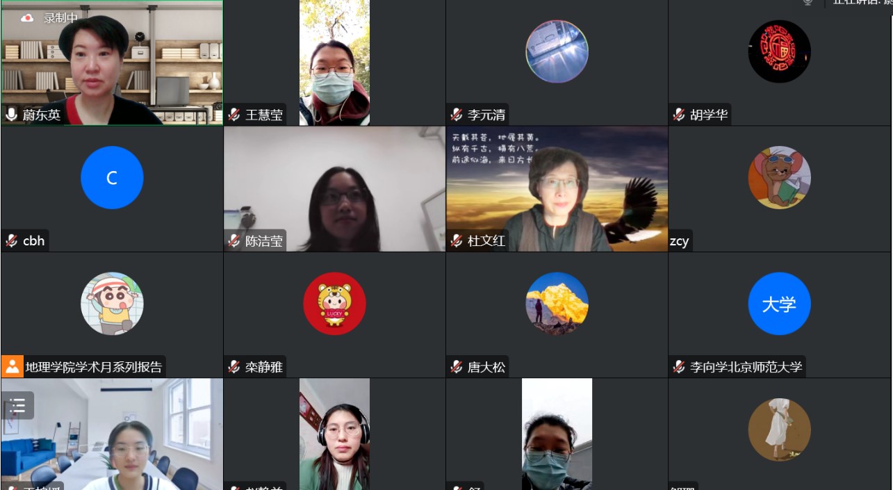 2022年11月9日上午9:30开始,杏吧视频 地理学院学术月系列报告——“以学生发展为本的高中地理教与学”线上报告顺利举办。本次学术报告由地理学院地理教育中心主任蔚东英老师主持,邀请北京80中正高级职称、特级教师杜文红老师为主讲嘉宾。虽然受疫情防控影响,此次学术报告由原来的线下线上报告形式改为线上报告,但是校内校外师生参与热情不减,达到了预期效果。