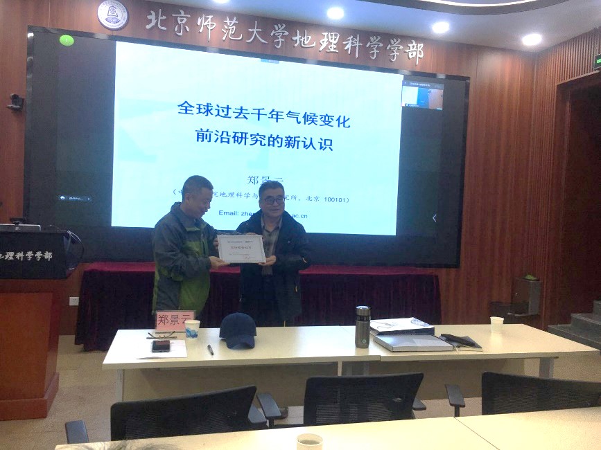 首先,地理学院自然地理研究所叶瑜副教授作为主持人向在座师生介绍了郑景云研究员:长期从事历史气候变化研究,在中国历史气候变化重建、成因机制与模拟,以及全球数据集成方面有着深厚的积累和卓越的学术贡献。其次,地理学院院长张科利教授代表学院致辞,强调了历史气候研究的重要性、对于目前从事气候变化研究的重要借鉴意义,并代表学院向郑景云研究员赠送了地理学院学术月邀请报告纪念。