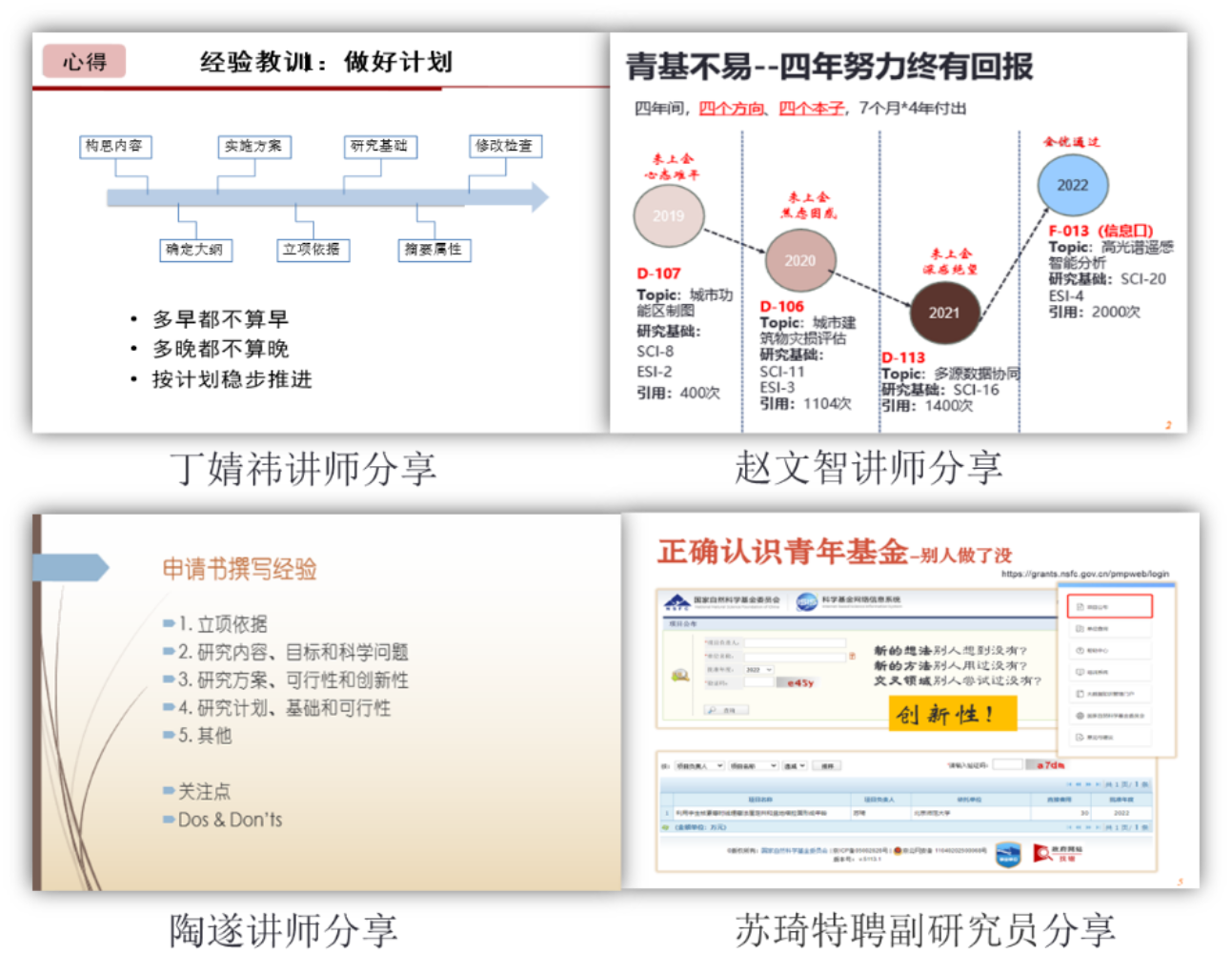 讲座分享环节,邀请北京校区丁婧祎讲师、陶遂讲师、赵文智讲师和珠海校区的苏琦特聘副研究员做报告,4位青年教师分别从不同的学科角度,详细分享了国家自然科学基金青年项目申请经验,介绍了青年基金对博士毕业生的意义、申请书选题、具体内容撰写以及个人心路历程和成长感悟。报告详实,情感真切,为学部青年学者申报青年基金提供了优秀范本和精神鼓励。
