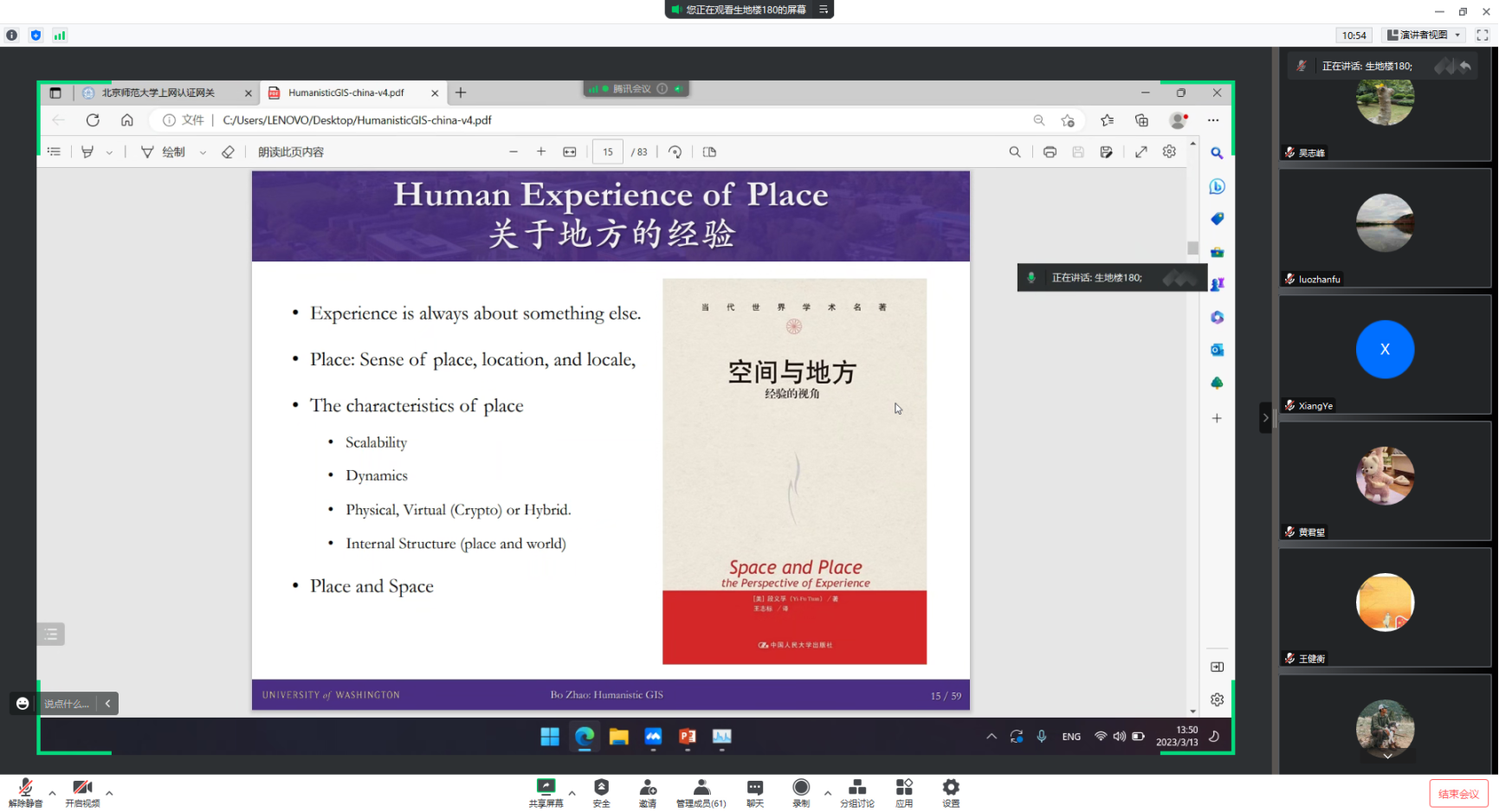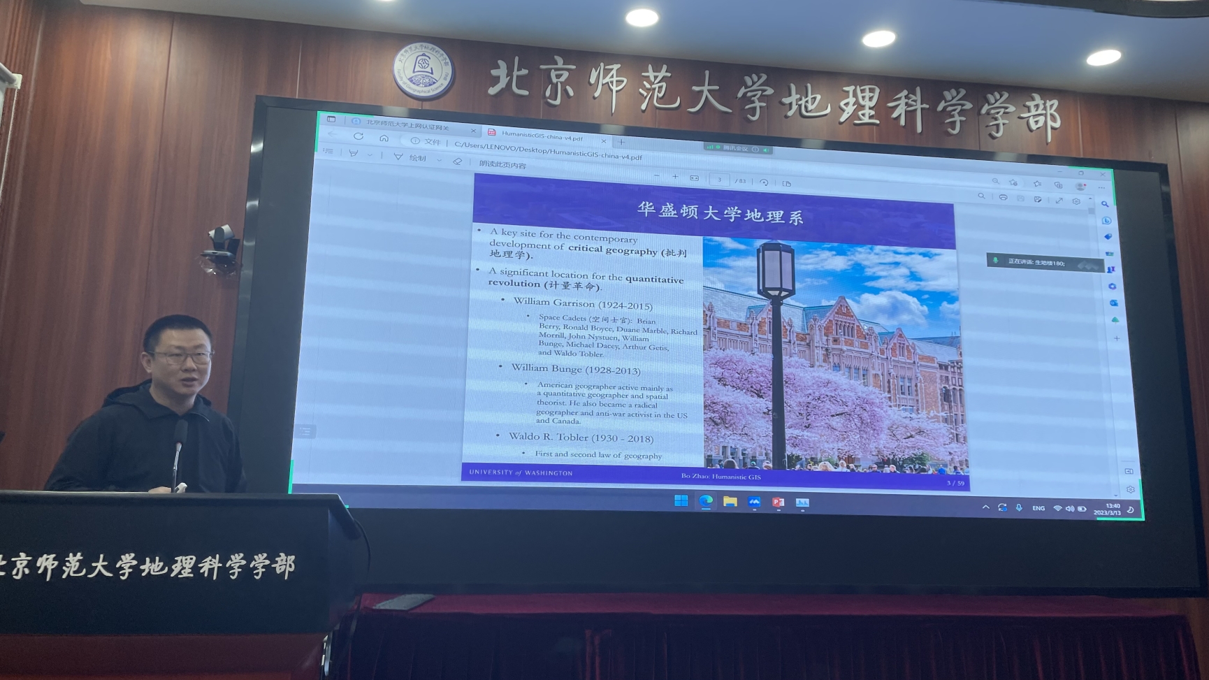 2023年3月13日下午,应董卫华教授邀请,华盛顿大学副教授赵博老师在生地楼180会议室作了题为“人文主义地理信息科学:面向一份研究议程”的报告,校内外共有70余位师生参加。