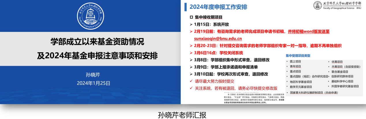 科研秘书孙晓芹老师作了“学部成立以来基金资助情况及2024年基金申报注意事项和安排”的汇报。学部成立以来,学部部长宋长青教授高度重视基金申报,经常进行基金申报动员、讲座与指导,2017-2023年学部共申请各类项目600余项,获批215项,年均超30项,涉及重大项目、重点项目、杰青、优青、联合基金、面上、青年、重大研究计划、国际合作及专项项目等十大类,其中重大项目2项、重点项目9项、杰青2项、优青5项、重点联合基金2项、组织间国际合作7项、面上127项、青年43项,平均资助率面上达40.97%、青年为44.93%。孙老师接着从限项、资助规则、科学问题属性的分类及简历要求等方面汇报了2024年基金申请变化,从指南要求、人员信息、正文填写等方面汇报了形审注意事项,最后按重要时间节点顺序汇报了学部2024年申报管理及服务工作安排。
