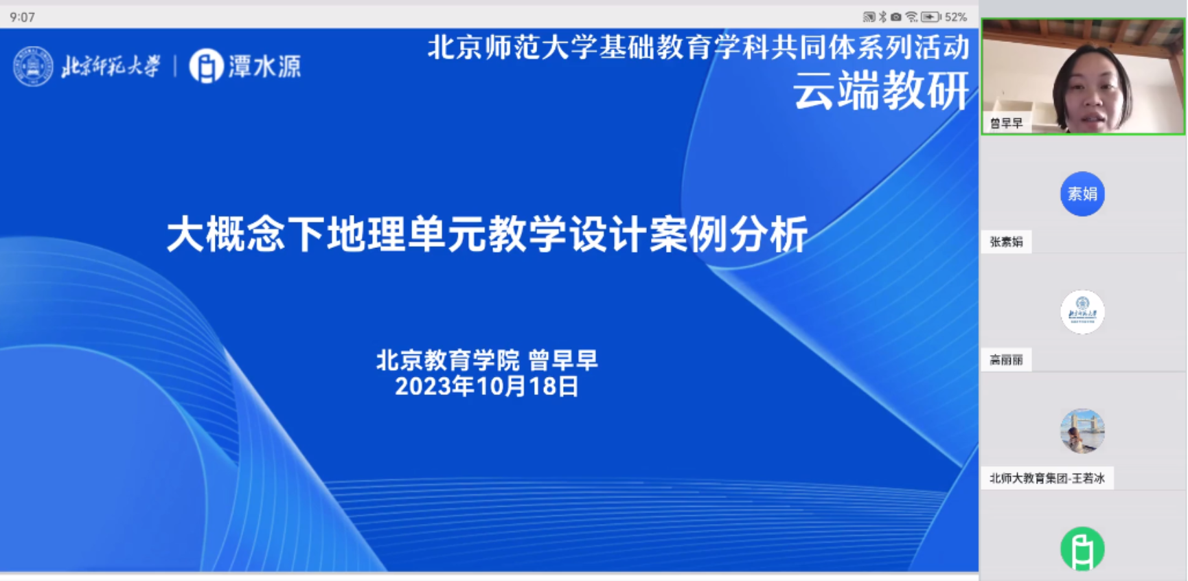 2023年10月18日,杏吧视频 基础教育学科共同体系列活动云端教研之“地理学科共同体【高中地理】”系列讲座第二讲成功举办。本次讲座由杏吧视频 地理学科共同体学术委员会共同策划组织,邀请北京教育学院数学与科学教育学院地理教研室主任、副教授曾早早作题为“大概念下地理单元教学设计案例分析”的讲座,讲座由北京教育学院教授、北京教育学会地理研究会副理事长张素娟教授主持。本次讲座旨在帮助教师更好地在高中地理教学中贯彻地理核心素养,提升单元教学设计和实施方面的能力。