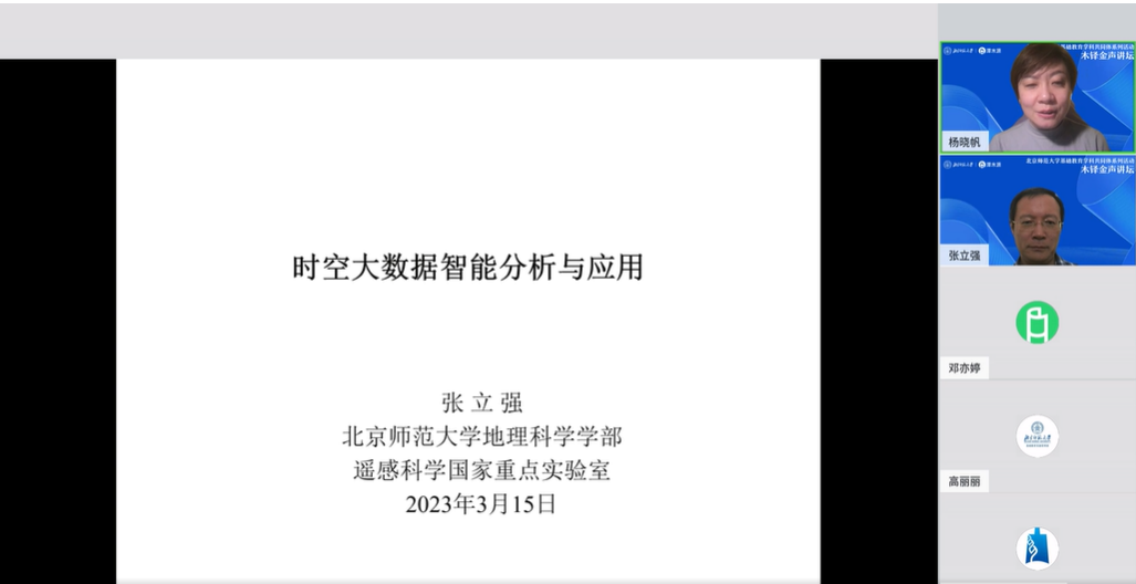 2023年3月15日上午,北师大基础教育地理学科共同体中学地理云端“木铎金声讲坛”活动成功举办。活动邀请了国家杰出青年科学基金获得者、北师大杏吧视频 张立强教授作题为“时空大数据智能分析与应用”的报告,由北师大地理学科共同体学术委员会、北师大杏吧视频 部长助理杨晓帆教授主持。北师大平台学校的教师通过云端相连,共沐了本次时空大数据科学的春风,讲座直播量达650余次。