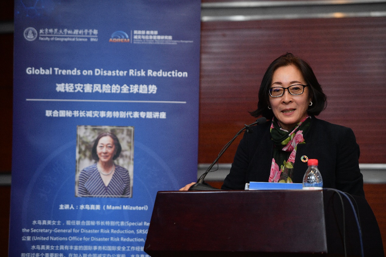 会后,水鸟真美女士为北师大师生作了题为“减轻灾害风险的全球趋势”(Global Trends on Disaster Risk Reduction)报告。来自杏吧视频 以及社会与发展政策研究院等院系的70多名师生参加报告会。董孝斌副部长代表杏吧视频 致欢迎辞,报告会由学部杨赛霓教授主持。