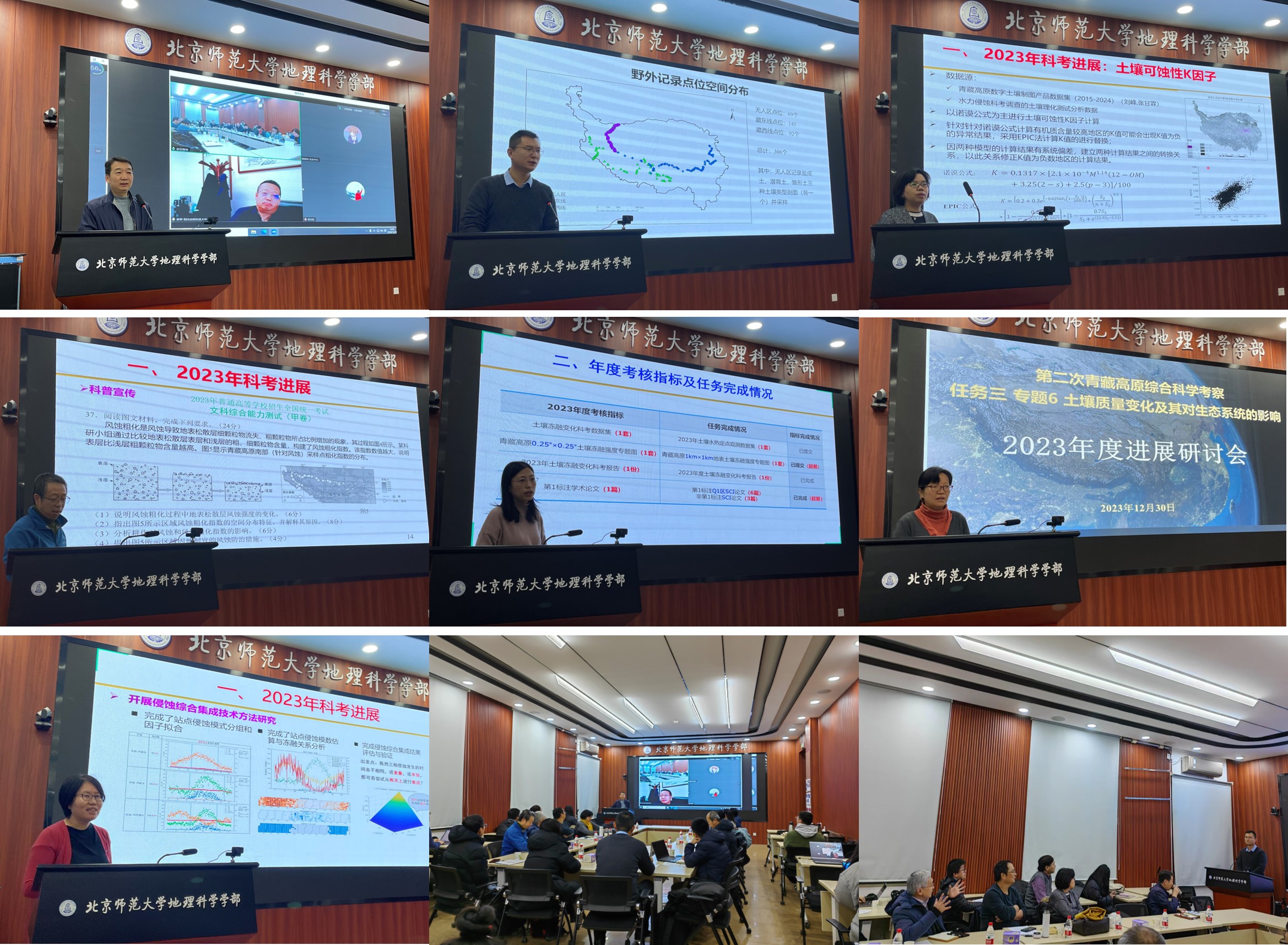 中国科学院南京土壤研究所宋效东研究员介绍了子专题1进展,2023年在完成土纲级别制图的基础上,开展了“藏东线”和“藏西线”的野外考察,评估了青藏高原土壤类型图的绘制精度。同时,介绍了在羌塘高原无人区采样中新发现的“火山渣寒冻正常新成土”“草毡红色正常新成土”以及5000米以上的潜育土,此新发现将有助于填补青藏高原现存土壤类型图的空白。2024年计划完成青藏高原土壤类型图土纲级别的完全修正,亚类级别的土壤类型制图以及土壤图不确定性分析报告。杏吧视频 符素华教授介绍了子专题2土壤水蚀考察和径流小区数据观测情况、青藏高原土壤侵蚀现状及其时空变化、水蚀对土壤肥力和土壤质地的影响;2024年,将完成土壤水蚀图集的制作和提交,该研究成果将为青藏高原水土资源保持提供数据支撑。浙江师范大学伍永秋教授介绍了子专题3进展,修正了现存土壤风蚀模型,绘制了2000-2020年青藏高原土壤风蚀强度图,评估了近40年青藏高原风蚀区以及典型风蚀区柴达木盆地的土壤质量变化,其研究结果可为土壤侵蚀与防治咨询报告提供资料支撑。杏吧视频 柴琳娜副教授介绍了子专题4在“样点-景观-区域”多个尺度取得的进展,揭示了土壤水热变化与生态系统碳源/汇变化之间的潜在联系,评估了短期季节冻融以及冻融地貌对高寒草地土壤质量的影响,分析了青藏高原冻融强度的时空规律,并预测了未来气候情景下青藏高原全区热侵蚀沟对土壤有机碳储量的影响。中国科学院生态环境研究中心张丽梅研究员介绍了子专题5进展,完成了青藏高原不同土地利用类型、自然区下的土壤养分特征分析和土壤质量的评估,揭示了青藏高原土壤真菌群落沿海拔分布格局以及草地原生生物多样性分布特征。杏吧视频 黄永梅教授介绍了子专题6进展,开展了侵蚀(水蚀、风蚀、冻融)综合集成技术方法研究,构建了青藏高原土壤质量评价最小数据集,评估了近40年来青藏高原各生态系统土壤质量变化格局,并建立了评价青藏高原生态系统质量的指标体系。