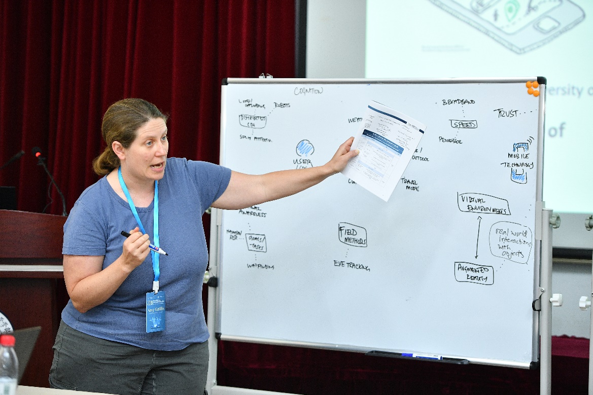 第二个部分由Amy Griffin博士主持。其中,墨尔本皇家理工大学的Denney Bradley同学做了题为“Location-Adaptive Design for Mobile Maps: The Case of Languages and Map Labels”的报告,以语言和地图注记为例,提出了位置自适应的移动地图设计要领;中国地质大学的方浩副教授做了题为“Pay Attention to the Influence of Landmarks and Path Design on the Navigation Effect of Indoor Maps”的报告,从诸多考量评估了地标和路线对室内地图导航效率和认知负荷的影响;维也纳技术大学的王望舒做了题为“Towards a Functional Ontology for Mobile Map Applications”的报告,从功能本体论的角度,解读了未来的移动地图应用设计。