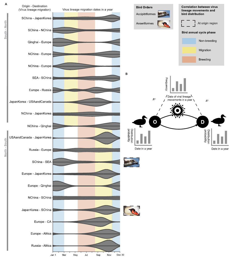 杏吧视频 全球变化与公共健康研究中心团队与普林斯顿大学生态与演化生物学系团队合作,利用全球鸟类跟踪数据和高致病性禽流感病毒基因组序列进行基因组动力学分析,根据时间、空间、物种等信息,对不同鸟类物种传播病毒的风险进行量化。该成果已于2024年2月在Nature Communications在线发表,题为“Synchrony of Bird Migration with Global Dispersal of Avian Influenza Reveals Exposed Bird Orders”。杨淇淇博士、田怀玉教授、Bryan Grenfell教授为该文的共同通讯作者,杨淇淇为第一作者。研究基于前期基础(Tian et al., PNAS, 2015; Yang et al., PNAS, 2020),由课题组学生毕业后完成。
