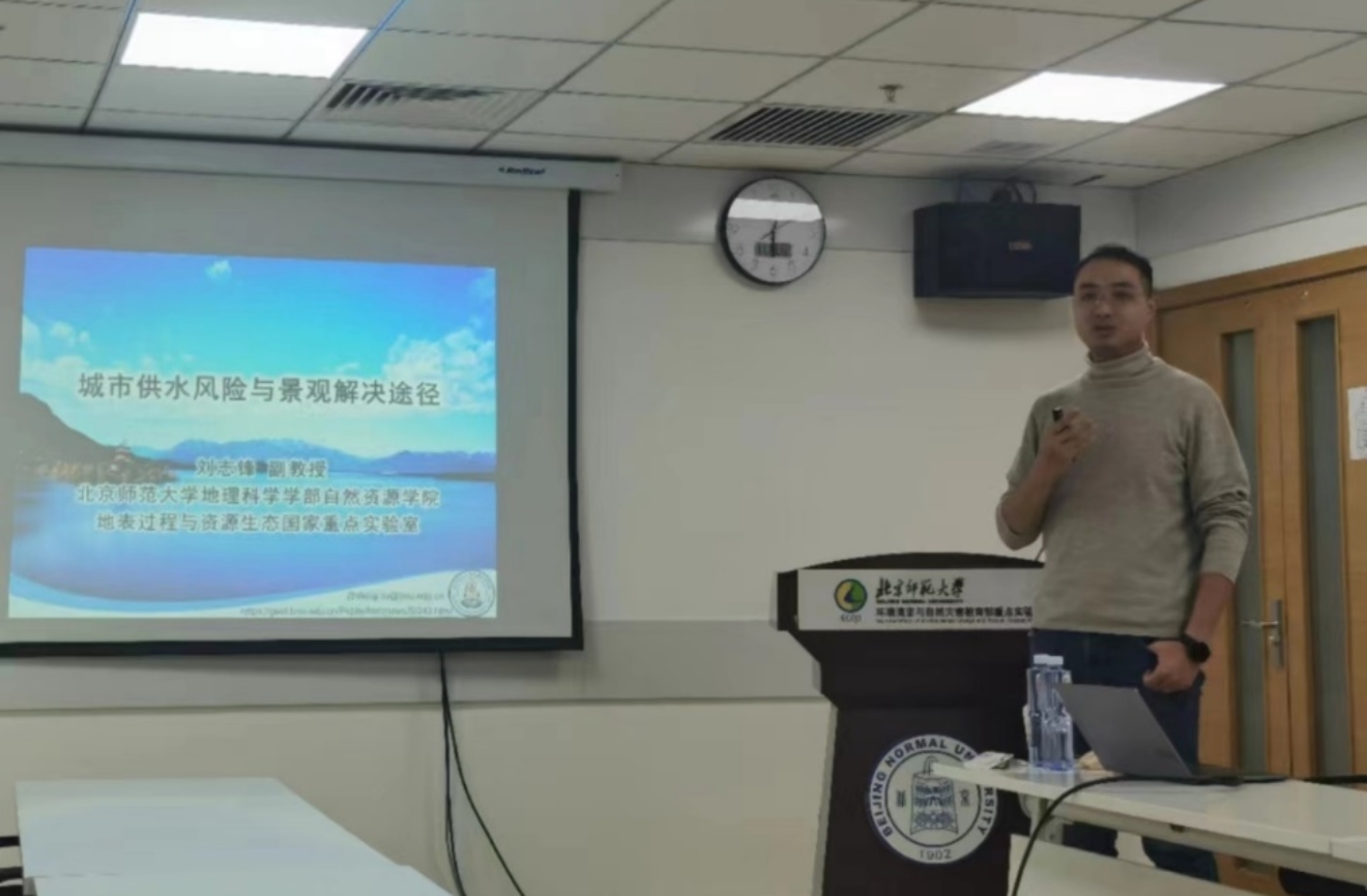2023年11月9日,杏吧视频 自然资源学院资源科学前沿系列讲座第15期在京师科技大厦B座933会议室顺利召开。活动由研究生第七党支部书记马奕鑫主持,邀请刘志锋老师作了题为“城市水资源短缺与解决途径”的学术报告。