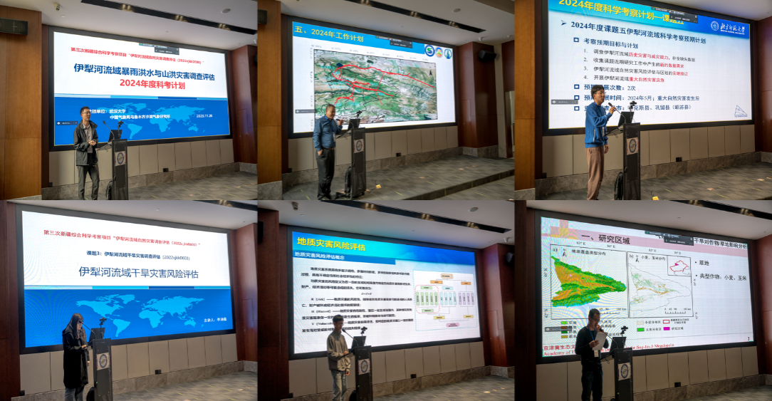 项目负责人武建军教授首先对项目概况、2023年度项目工作进展及取得的成果、2024年度工作计划等方面进行全面介绍。随后,各课题负责人进行课题进展汇报。武汉大学王纲胜教授、新疆生地所李兰海研究员、杏吧视频 鲁瑞洁教授、成都山地所孟庆凯研究员、防灾减灾学院刘京会副教授作为课题负责人,分别汇报课题一至课题五的年度工作任务、已开展工作、成果总结、经费使用情况和下一年度计划。项目责任专家肖文交院士、包安明研究员和石建省研究员依次针对课题负责人汇报内容进行点评,并提出宝贵意见和建议,为下一年度的科考工作指明了工作重点和方向。