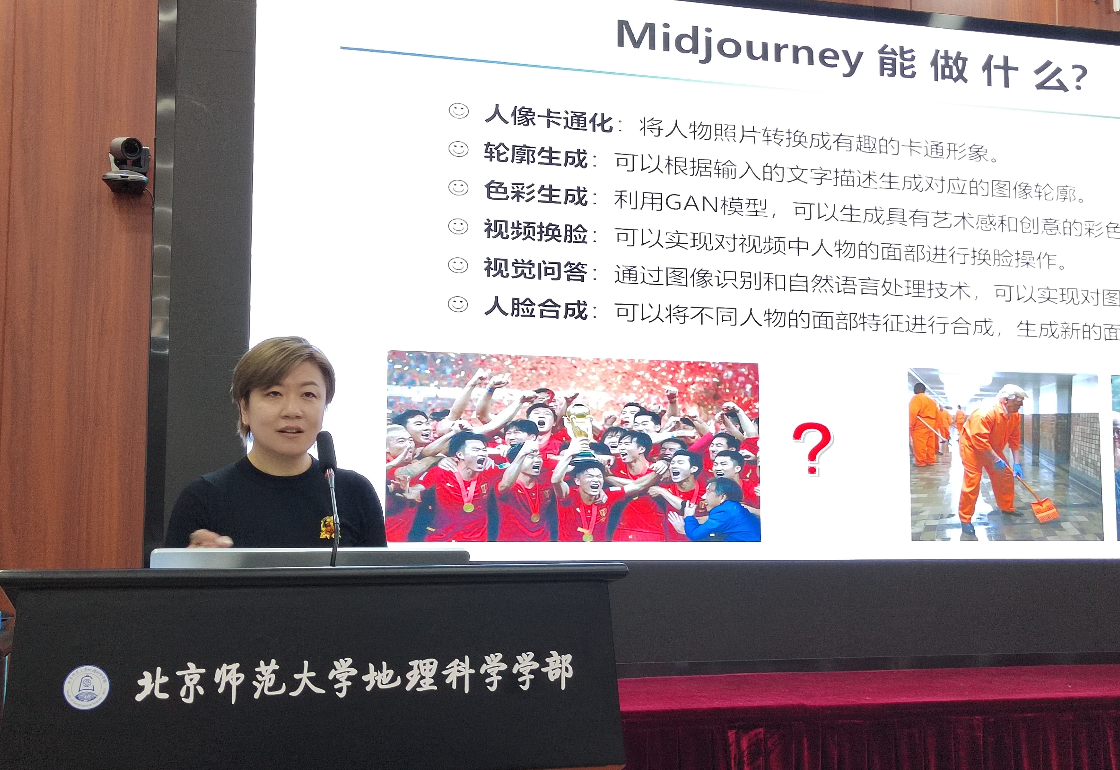 杨晓帆教授作题为“让机器‘画画’的Midjourney”的报告。杨老师从近期探讨人工智能对科研领域影响的文章入手,指出教育和科研工作者应时刻关注新兴技术和工具并将此融入到日常教学和科研工作中。接着以“光伏治沙、黑河流域、高原湖泊”的科研概念图绘制为例,对Midjourney这一基于人工智能的绘图平台的功能和操作进行了全面的讲解演示。通过简单的关键词指令,Midjourney即可迅捷地提供AI绘图结果,但结果可能具有较大的理解偏差,绘图情景往往是生硬地拼凑关键词元素或具有过度的虚拟化特征而偏离现实情景。随后,杨老师分享了Midjourney的使用心得,即需要多次的尝试和摸索,优化、增加更多的细节描述,正确地表达绘图需求,直至符合预期效果。